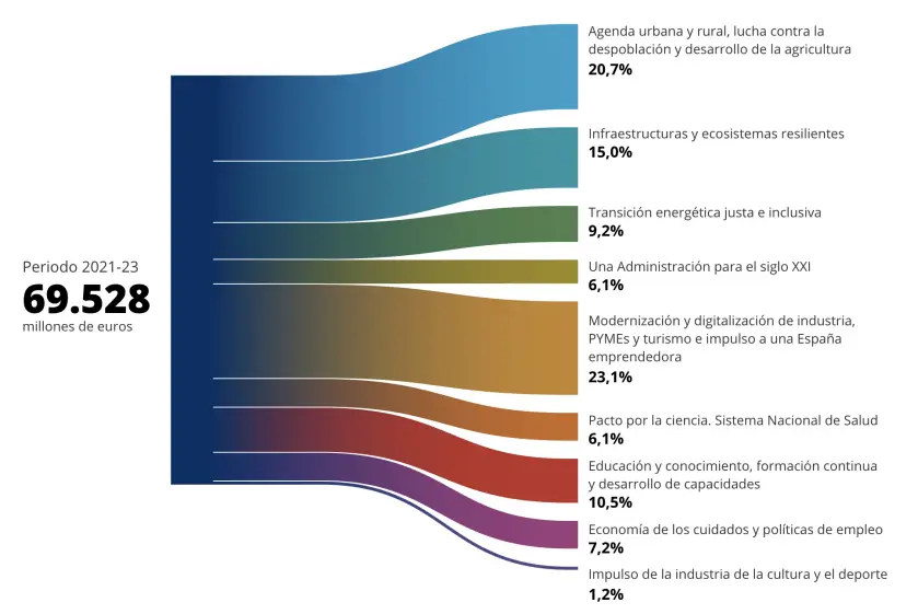 In Spain, the Recovery, Transformation and Resilience Plan foresees the mobilisation of more than 140 billion euros of public investment until 2026, with a strong concentration of investments and reforms in the first phase of the Next Generation EU plan, which covers the period 2021-2023, in order to boost recovery as soon as possible and achieve a maximum impact of investments to reverse the negative cycle in which the economies are in.