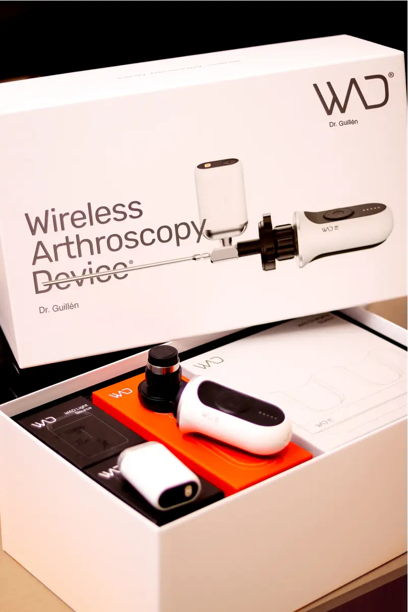 The second generation WAD® Dr. Guillén, whose commercialisation and use is aimed solely and exclusively at healthcare professionals, consists of a wireless ultra high definition camera, capable of working at a resolution of up to 4K and 60 FPS (frames per second), a light source, also wireless, and a charging station. The device allows cordless arthroscopy operations, enabling cost-effective and safe interventions from locations where there is no power supply, such as field hospitals, farms and the like.