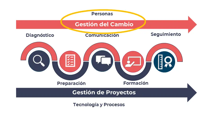 - Preparación: planificación de todos los procesos técnicos asociados al cambio, para asegurar que se lleva a cabo minimizando el impacto negativo en la actividad de la empresa y sus empleados.