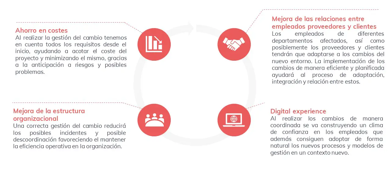 Una gestión del cambio correcta y eficaz aportará beneficios tales como: