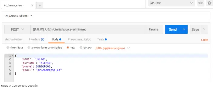 La cabecera de cuerpo (Body) muestra los datos que se mandan con la petición. En este caso, se envía un texto json con los datos del cliente que se va a crear. En la Figura 5 se muestran dichos datos del cliente, que son el nombre, apellido, teléfono y email.