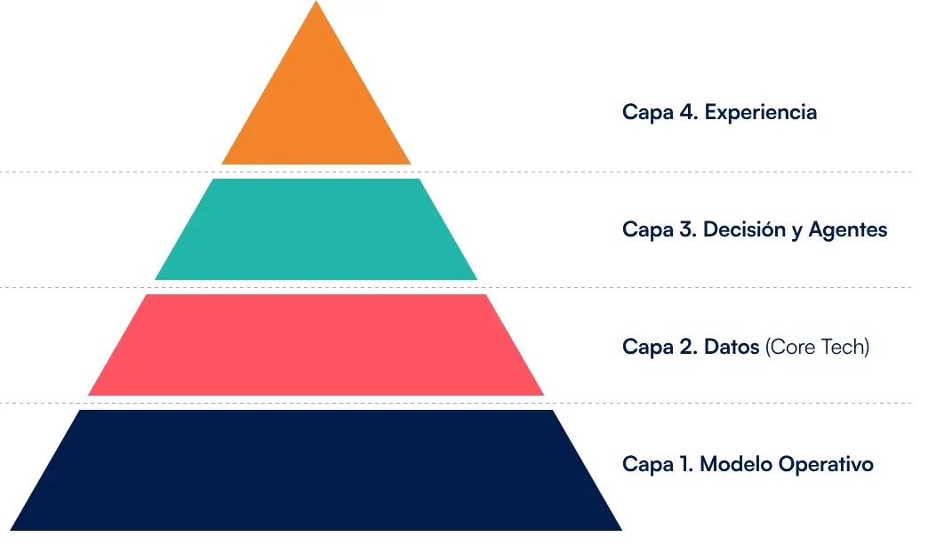 El planteamiento se organiza en cuatro capas que buscan evitar saltos improvisados: cada nivel se apoya en el anterior y permite avanzar con coherencia. Son Productividad, Infraestructura, Eficiencia y Experiencia de usuario.