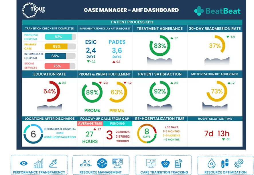Un Cuadro de mandos clínico para mostrar de forma transparente los resultados mediante la monitorización continua del estado de salud de los pacientes y los datos clínicos y KPIs más importantes de los procedimientos clínicos, sirviendo como punto focal objetivo del estado del proceso. Los cuadros de mando clínicos del proceso del paciente con Insuficiencia Cardiaca muestran datos, alarmas y procesos en curso relacionados con el paciente, para una actuación rápida y eficaz, ayudando a la toma de decisiones y centrándose en la gestión de los recursos sanitarios, tanto dentro del hospital como entre otras entidades de la cadena asistencial, como la atención domiciliaria o la hospitalización a domicilio.