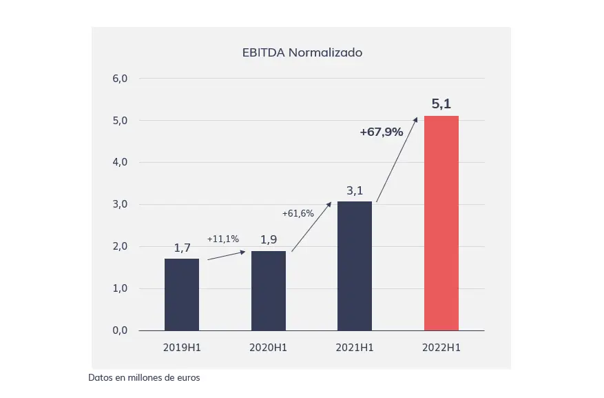 Por su parte, la información recogida por Bolsas y Mercados Españoles (BME) destaca su Ebitda normalizado, con 5,1 millones de euros, apartado en el que también intensifica su crecimiento, mejorando un 67,9% los datos presentados en el primer semestre del pasado ejercicio.