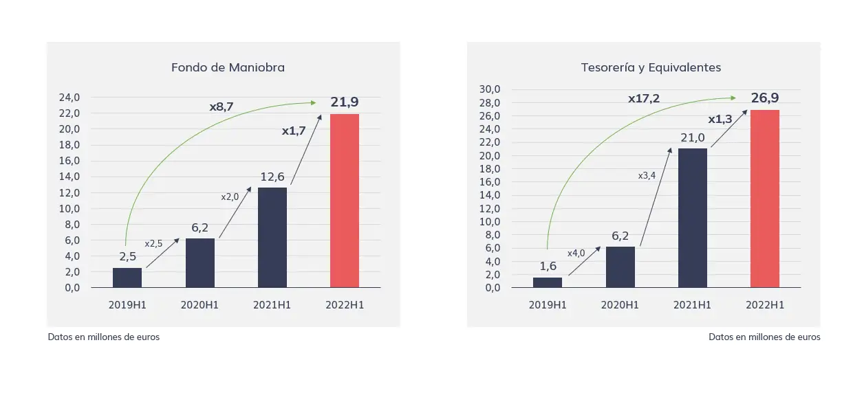 En términos de solvencia, la compañía encargada de la transformación digital de grandes empresas y administraciones presenta unos números que casi duplican su fondo de maniobra respecto al primer semestre de 2021, alcanzando los 21,9 millones de euros, frente a los 12,6 millones en el periodo análogo del ejercicio anterior. Desde que entrara a cotizar en el BME Growth en 2019 (antiguo MAB), Izertis ha incrementado un 768% la cuantía en este apartado.