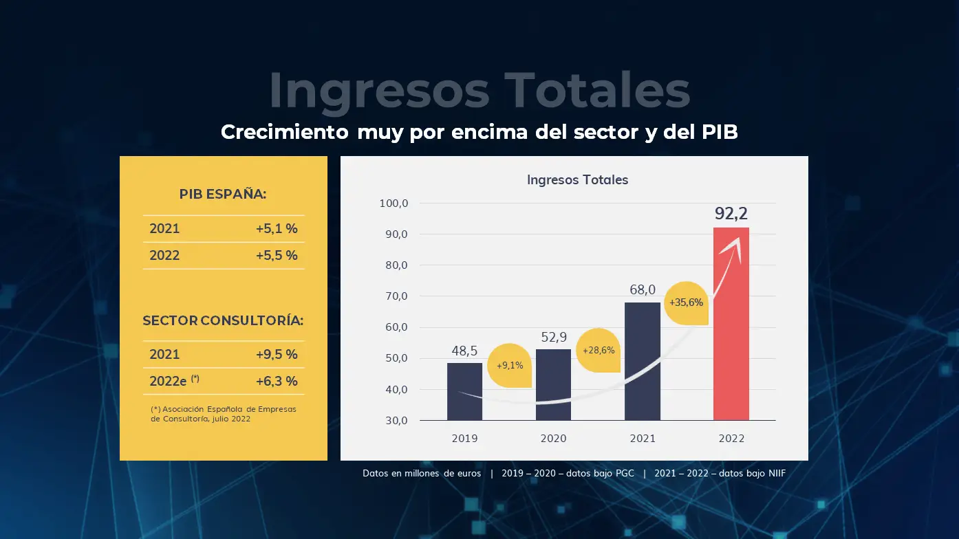 La consultora tecnológica Izertis ha publicado este miércoles sus resultados financieros de 2022 en los que ha alcanzado los 92,2 millones de euros de ingresos totales. Esto supone un incremento del 35,6% respecto a 2021 y consolida la aceleración del crecimiento mostrada en 2021 (+28,6%) y 2020 (+9,1%), es decir, un 90% en 3 años.