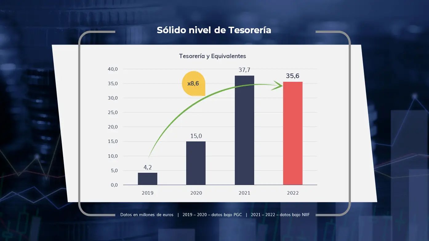 Siendo 2022 un ejercicio récord en cuanto al desembolso por adquisiciones, la compañía presenta una tesorería de 35,6 millones de euros, multiplicando por 8,6 veces los 4,2 millones presentados hace tan solo 3 años.