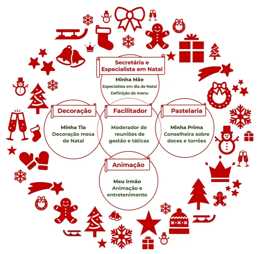 Para isso, formámos o círculo "comité de Natal". O objetivo deste círculo era definir o projeto do dia de Natal e nele incluímos vários membros da família com os seus papéis bem definidos.