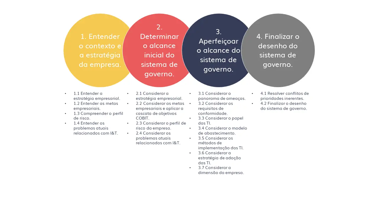 - Na fase 7 – Rever a eficácia; identificam-se outros requisitos de governo e gestão, e reforça-se a necessidade de uma melhoria contínua. Além disso, são priorizadas as oportunidades para melhorar o modelo de governo.